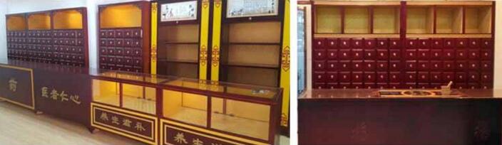 目前药店中药柜的颜色大部分以枣红色为主,也有原木色的但需要订做,这可根据您的喜好进行选择!